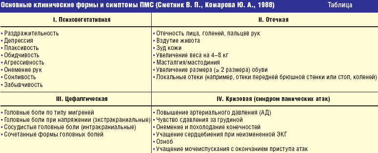 Выделяют психовегетативную, отечную, цефалгическую и кризовую («синдром панических атак») формы заболевания [1]. Однако чаще всего эти симптомы носят комплексный характер. Кроме того, в настоящее время, согласно Международной классификации психических болезней (МКБ-10) от 1994 г., пароксизмальные расстройства (панические атаки) относят к классу «тревожных расстройств». В связи с чем «кризовую» форму ПМС скорее можно отнести к «психовегетативной» форме заболевания и разница состоит только в перманентном или пароксизмальном характере симптомов.