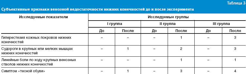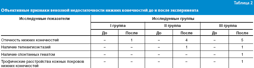 Общее количество выявленных объективных признаков венозной недостаточности у испытуемых трех групп после длительной гиподинамии представлено в табл. 2.