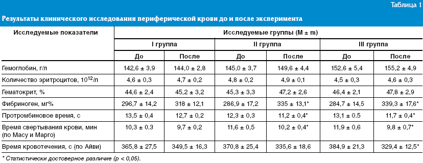 Данные, представленные в табл. 1, свидетельствуют, что наибольшие изменения исследуемых показателей были выявлены в контрольной группе, где после длительной гиподинамии в термоизолирующей камере статистически достоверно уменьшалось время свертывания крови, время кровотечения и протромбиновое время, а также возросла концентрация фибриногена. Во второй группе, где в качестве профилактического средства использовалась комбинация Аспирина с аскорбиновой кислотой, наблюдалось достоверное увеличение концентрации фибриногена и уменьшение протромбинового времени и времени свертывания крови. В первой группе, в которой в качестве профилактического средства применялся Вобэнзим, была отмечена только тенденция к увеличению концентрации фибриногена. Однако достоверных изменений исследуемых показателей в 1 группе не было отмечено.