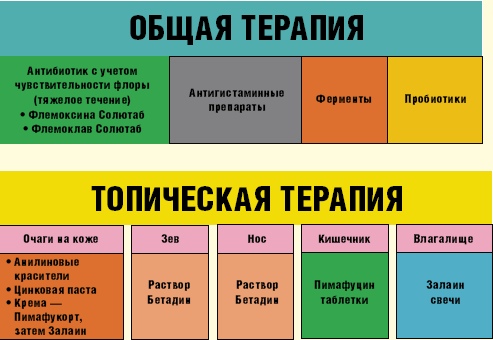 Выбор топической терапии зависел от локализации процесса. Использовали Пимафуцин в виде таблеток, растворимых в кишечнике и не обладающих системным действием. Препарат назначали по 100 мг 4 раза в день 7–10 дней. Для обработки очагов в полости рта применяли универсальный антисептик «Бетадин» в виде раствора. Бетадин разводили из расчета 20 капель на 1/3 стакана воды. Им полоскали горло и промывали носовые ходы утром и вечером. Для обработки очагов кандидоза на коже (вульвит, баланопостит, перианальный кандидоз, межпальцевая эрозия, паронихия и т.п.) использовали крем «Залаин». Его наносили 2 раза в день в течение 2–4 недель (до разрешения клинических проявлений плюс неделя). Для лечения проявлений нуммулярной экземы с учетом остроты процесса последовательно использовали анилиновые красители, пасту цинка и крем «Пимафукорт», для лечения кандидозного вульвовагинита у женщин— свечи «Залаин».