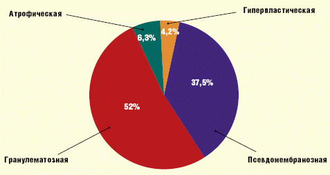 Учитывая, что кандидозный глоссит выявлен практически у всех пациентов с МЭ, ассоциированной с кандидозом, проанализирована встречаемость его клинических форм. Использована общепринятая классификация кандидозного глоссита. Преобладала гранулематозная форма (52%) (рис.1). Она характеризовалась небольшой обложенностью языка белым, плотно сидящим налетом и наличием у его корня ромбовидного или овального очага с множеством сосочков, высотой до 3 мм, напоминающих «булыжную мостовую». При бактериоскопическом исследовании налета с поверхности сосочков обнаружен псевдомицелий. Псевдомембранозная форма глоссита («молочница», soor), лидирующая при изолированном кандидозе слизистых оболочек, выявлена лишь у 1/3 (37,5%) больных. Атрофическая и гиперпластическая формы наблюдались в единичных случаях.