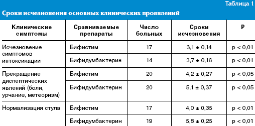 Как показали проведенные клинические наблюдения, в обеих группах отмечался положительный клинический эффект. На фоне применения исчезали диспептические явления, боли, урчание в животе, нормализовался стул, улучшалось общее состояние. На фоне лечения Бифистимом отмечались достоверно более быстрое исчезновение симптомов интоксикации, нормализация стула, прекращение диспептических явлений (табл. 1).