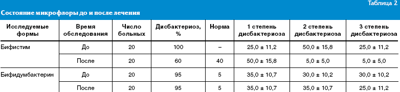 Проведенные исследования микрофлоры кишечника показали, что у всех больных обеих групп выявились выраженные дисбиотические нарушения 2–3 степени. Общий микробный пейзаж характеризовался уменьшением количества облигатной микрофлоры с преимущественным снижением бифидо- и лактобактерий, а также увеличением условно-патогенных бактерий (энтерококки, цитробактер, кишечная палочка). После проведенного лечения Бифистимом отмечалась выраженная нормализация показателей состояния микрофлоры, представителей коли-, бифидо- и лактобактерий, чего не было в контрольной группе (табл. 2).