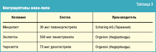 - прогестагенсодержащие контрацептивы (мини-пили) (табл. 3).