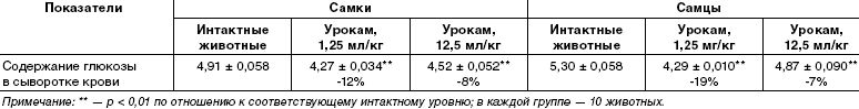 Изучение изменения биохимических показателей показало, что длительное введение сиропа Урокам привело к достоверному по сравнению с интактными животными снижению содержания глюкозы в крови (табл. 3) примерно в равной степени у самок и самцов.
