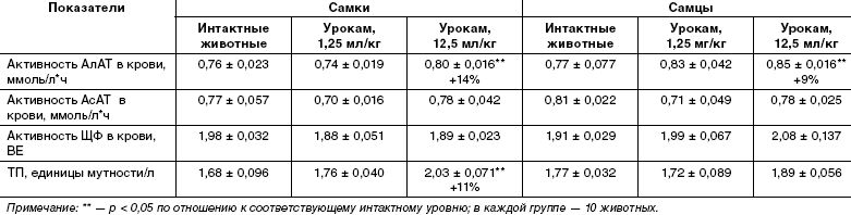 Такие биохимические показатели, как содержание общего белка, альбуминов и глобулинов, соотношение альбуминовой и глобулиновой фракций, содержание холестерина, мочевины и общего билирубина в крови, характеризующих состояние белкового, липидного, пигментного обменов, антитоксическую функцию печени и состояние почек, при введении Урокама в обеих дозах достоверно не изменились по сравнению с контрольной и интактной группами. Было отмечено лишь незначительное повышение в крови активности АлАТ у самцов и самок при неизменной активности АсАТ и ЩФ и повышение уровня ТП у самок при длительном применении исследуемого препарата в дозе, превышающей терапевтическую в 10 раз (12,5 мл/кг) (табл. 4). Эти изменения были более выраженными при применении у самок, хотя были незначительными и не выходили за рамки физиологической нормы.